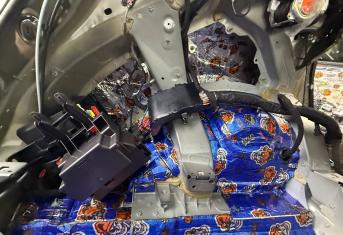 Для всей поверхности пола, от максимального подворота под торпеду до багажника включительно первым слоем применяем Шумофф Super Jack. Для задних арок в багажнике используем более легкий материал Шумофф Jack.