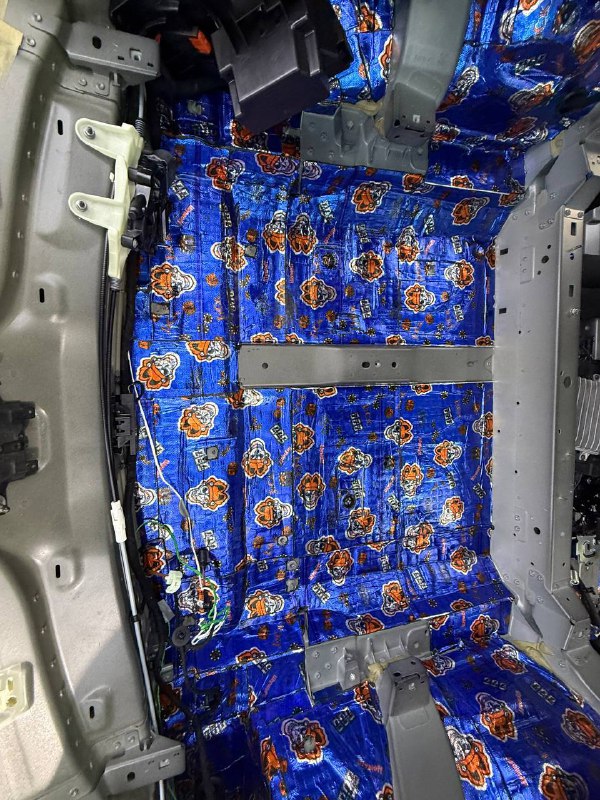 Приступаем к работам с полом, на разборку всего салона уходит около 1 часа. После чего мы подготавливаем поверхность, очистив ее от пыли и предварительно обезжирив. Штатная виброизоляция хорошо держится и её мы не демонтировали.