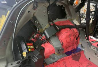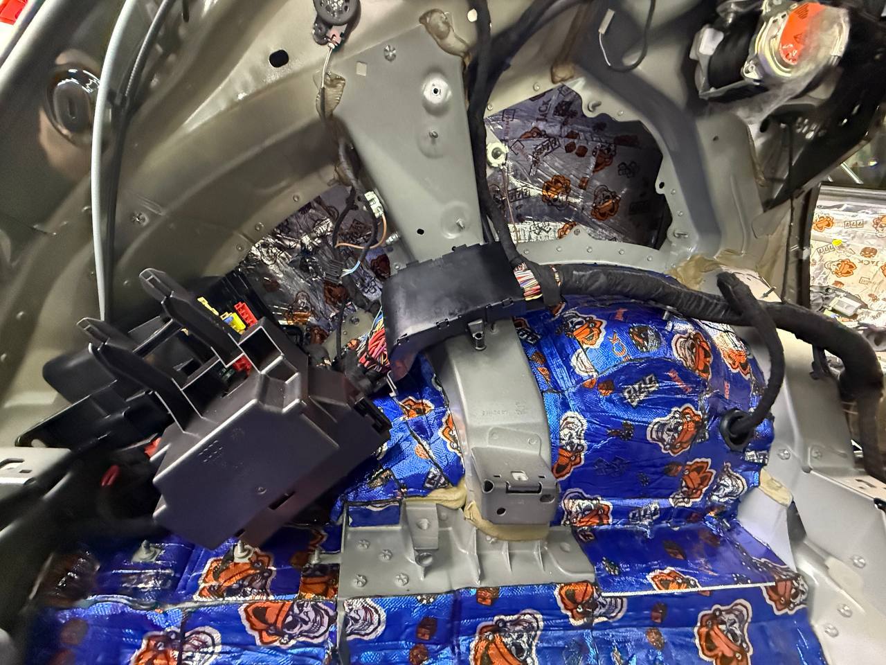 Второй слой – Шумофф Prizma шумоизолятор на основе вспененного каучука со звукоотражающей мембраной, это современный и технологичный материал который включает в себя сразу два слоя! Его мы применяем на всю плоскость пола салона и багажника в том числе и задние арки в багажнике. В задние крылья вторым слоем монтируем шумопоглотитель Шумофф Absorber А15, максимально закрывая всю плоскость крыла на сколько это позволяет конструкция автомобиля.