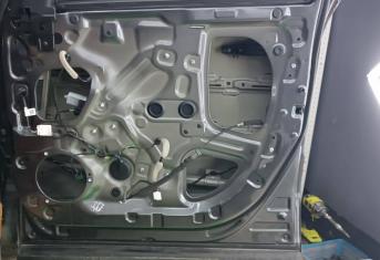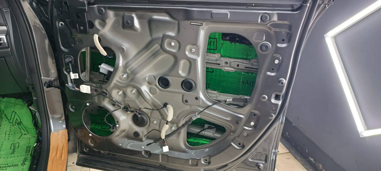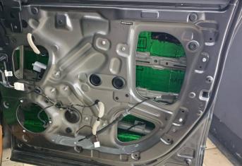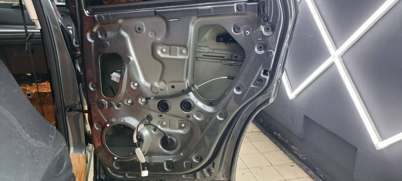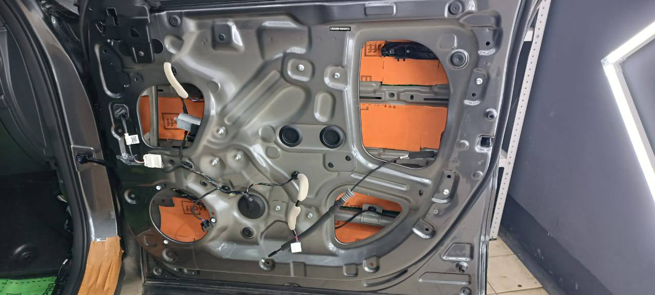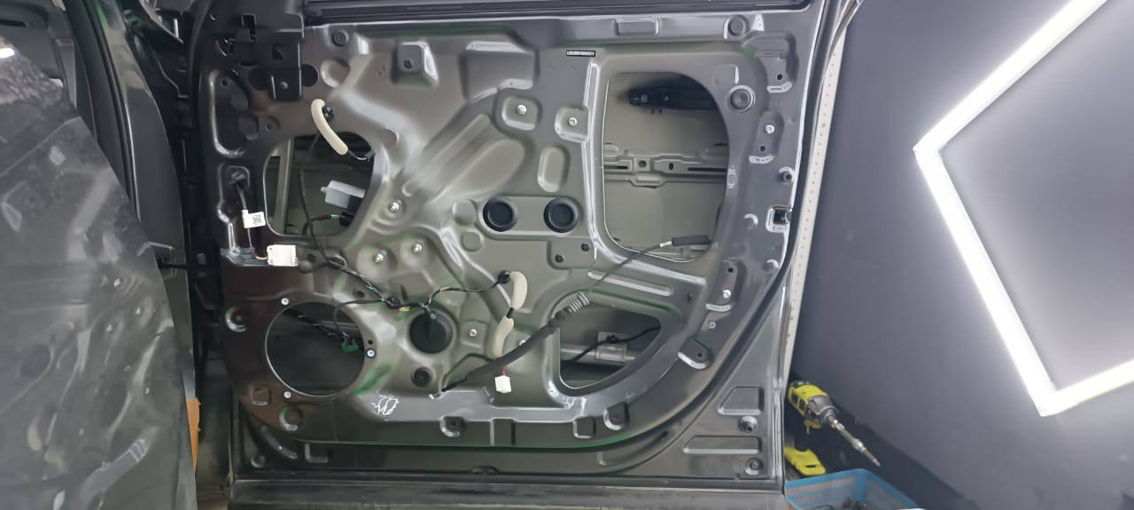 Начинаем работу с разборки дверей, подготовки поверхности и обезжириванию. Все работы по демонтажу пластика выполняются специальным инструментом. Мы гарантируем целостность клипс, креплений и отсутствие различного рода царапин, задиров на обшивках.