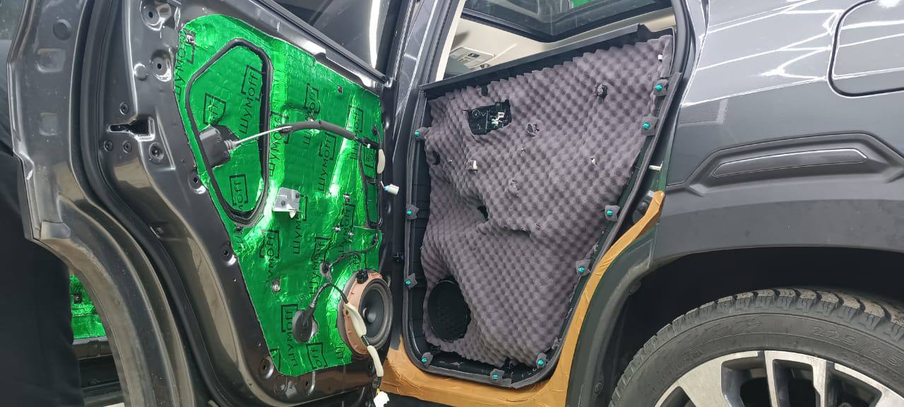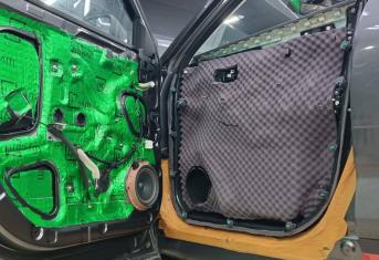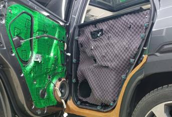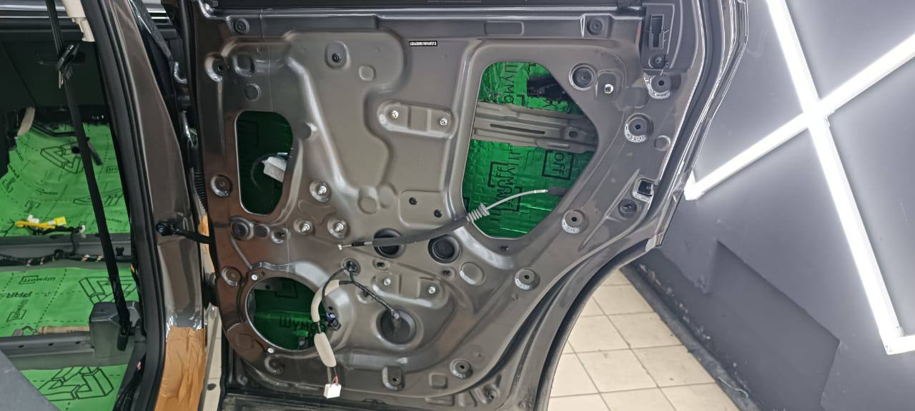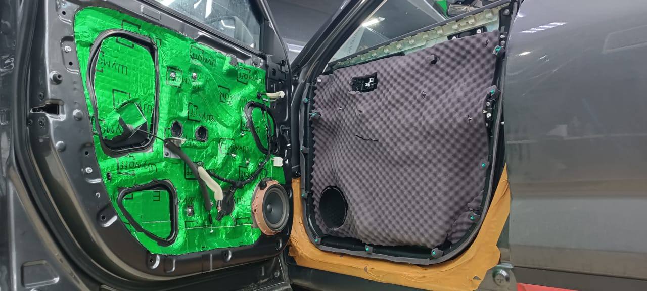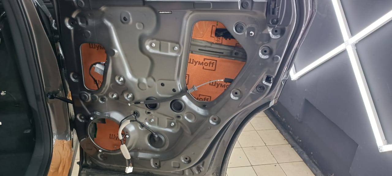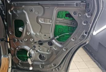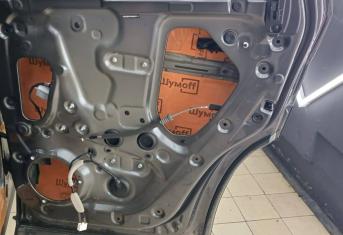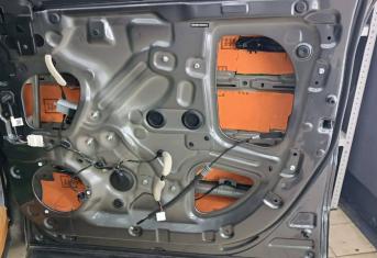 Вторую стенку двери обрабатываем Шумофф М2. Саму обшивку двери локально оклеиваем виброизоляцией Шумофф М2 для снижения резонанса пластика и полностью закрываем шумопоглощающим материалом Шумофф Absorber А15. По канту обшивки двери укладываем Шумофф Absorber 5, а на открытую проводку Шумофф Specific.