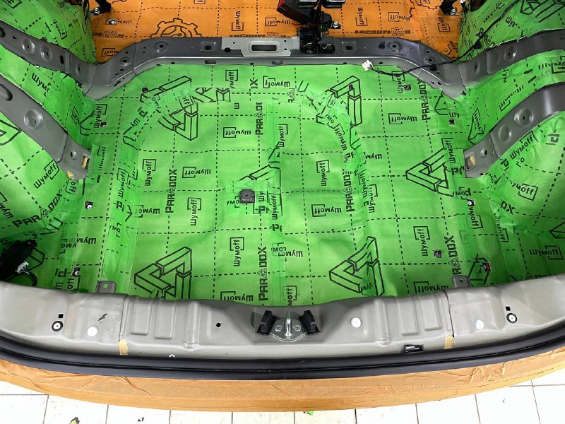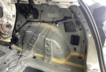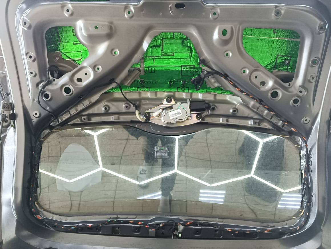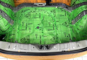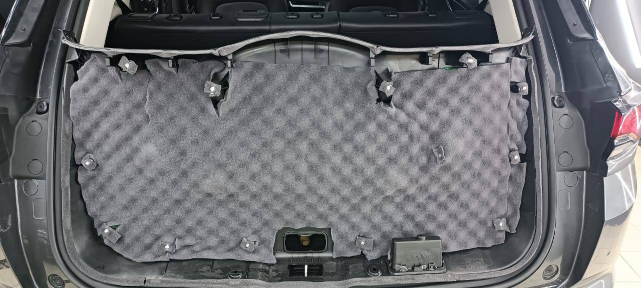 На крышку багажника укладываем виброизоляцию Шумофф М2. На обшивку Шумофф Flex A15. Максимально легкие материалы, чтобы не нагружать электропривод задней двери.