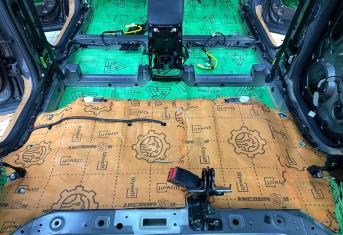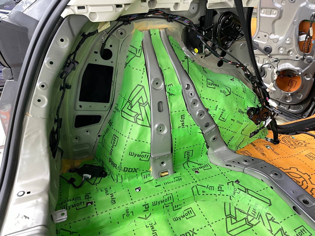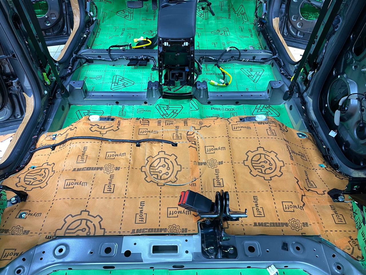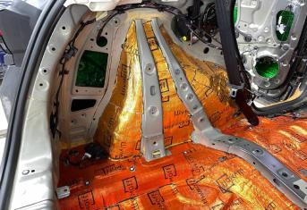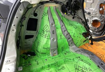 Вторым слоем для шумоизоляции пола мы используем Шумофф Парадокс для всей нижней части салона за исключением места под задним сидением, туда монтируем Шумофф Композит, чтобы избежать проблем со установкой заднего сидения. Это новые материалы от производителя Шумофф, которые включают в себя сразу два слоя и кратно повышают результативность. На задние крылья наносим шумопоглотитель Practick Flex A15.