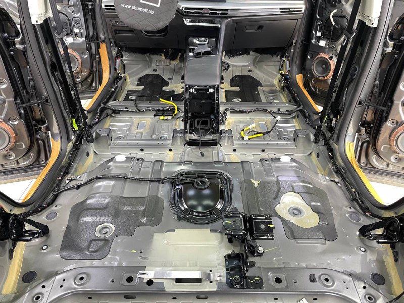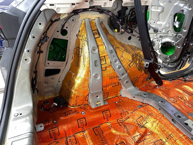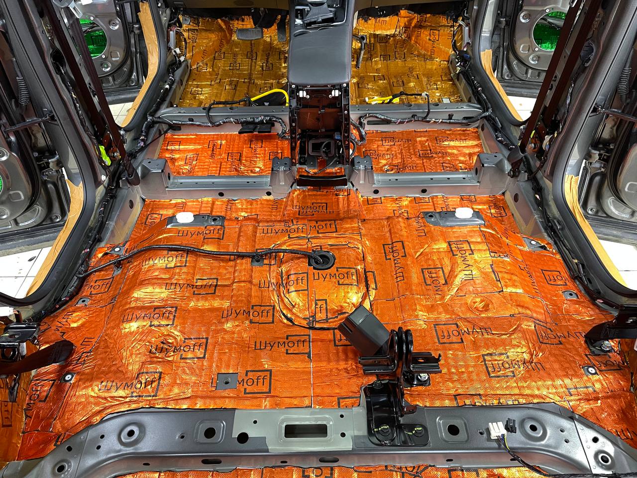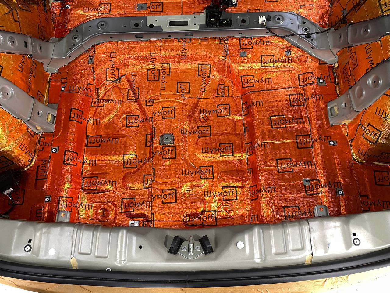Первым слоем укладывается виброизоляция Шумофф М4, М3 и М2, разница в толщине, весе и зоне применения материала. Шумофф М4 пойдет на переднюю часть пола и задние арки. Остальную поверхность обрабатываем Шумофф М3. М2 отлично подходит для задних крыльев. Поверх усилителей она не наносится, чтобы избежать парникового эффекта и появлению влаги под ковром.