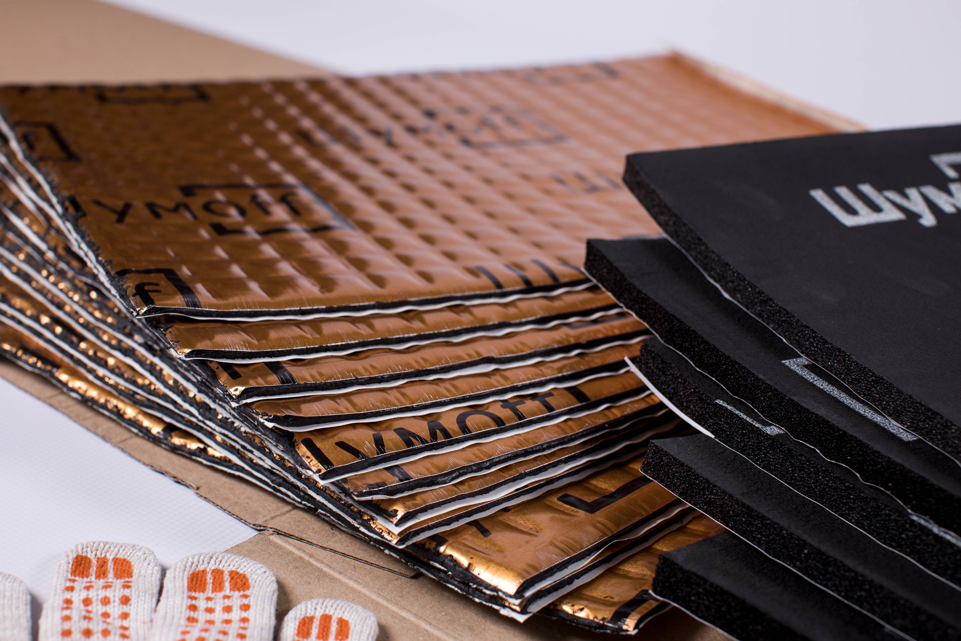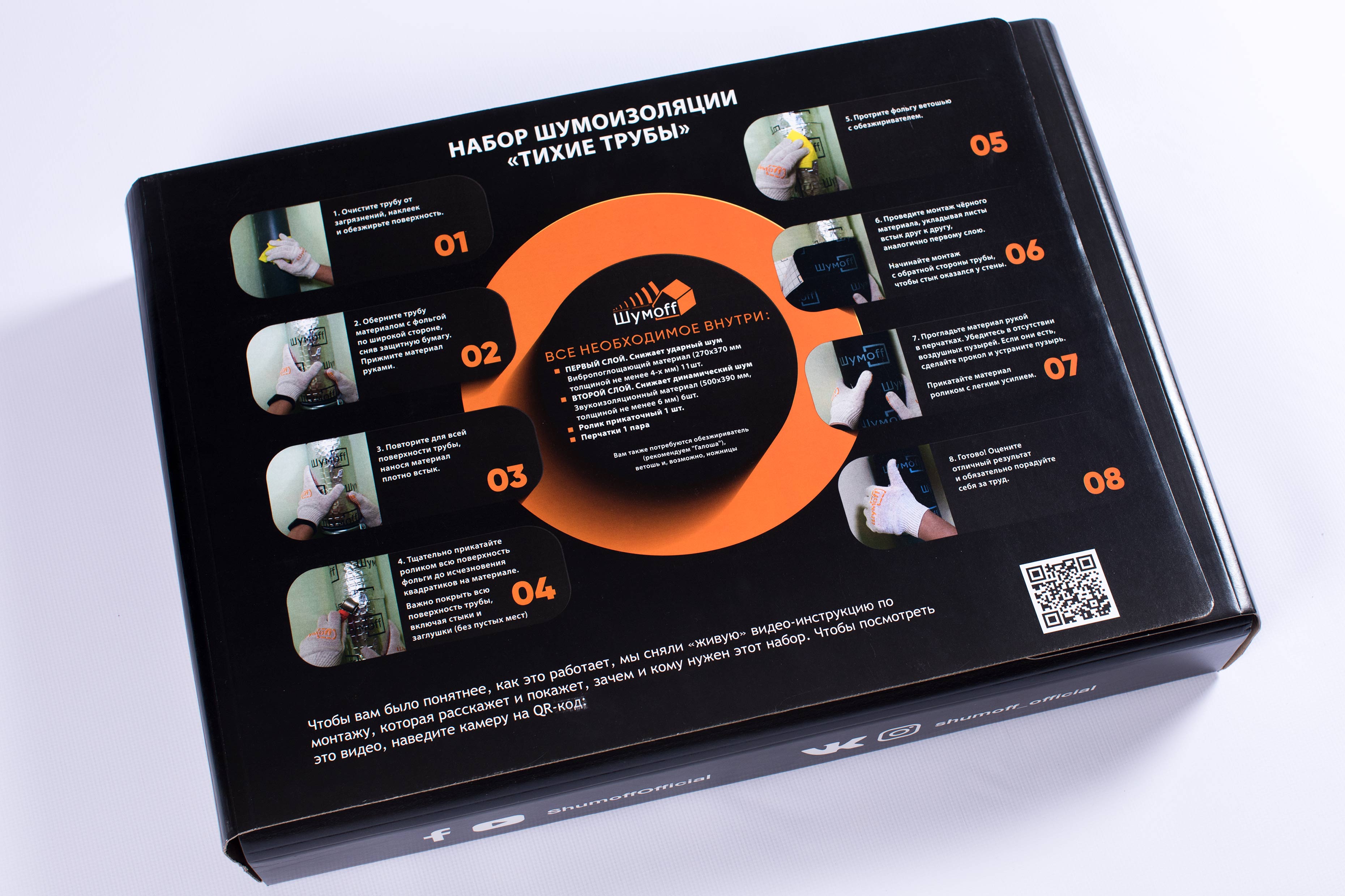 Набор для шумоизоляции пластиковых труб — В комплекте 11 листов виброизоляции, 6 листов тепло-звукоизоляционных материалов, ролик и перчатки.