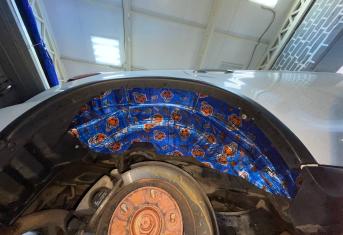 На металл передних арок, сторона к салону, и проем между кузовом и крылом наносим виброизоляцию Шумофф Super Jack. Это технологичный и эффективный вибродемпфер толщиной 3,6 мм с повышенным уровнем адгезии что позволяет ему прекрасно работать в такой агрессивной среде как арки с улицы. На задние арки монтируем виброизоляцию Шумофф Super Jack по всей поверхности металла и наносим жидкий полимер.